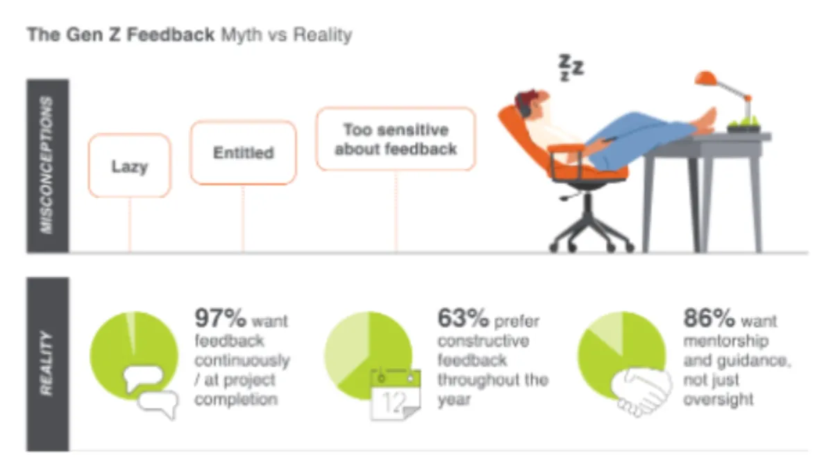 "Research has shown that Gen Z workers are not afraid to make mistakes and learn from them. 97% of Gen Z are receptive to receiving feedback on an ongoing basis or after completing a large project or task. Meanwhile, 63% say they prefer to receive timely constructive feedback throughout the year.